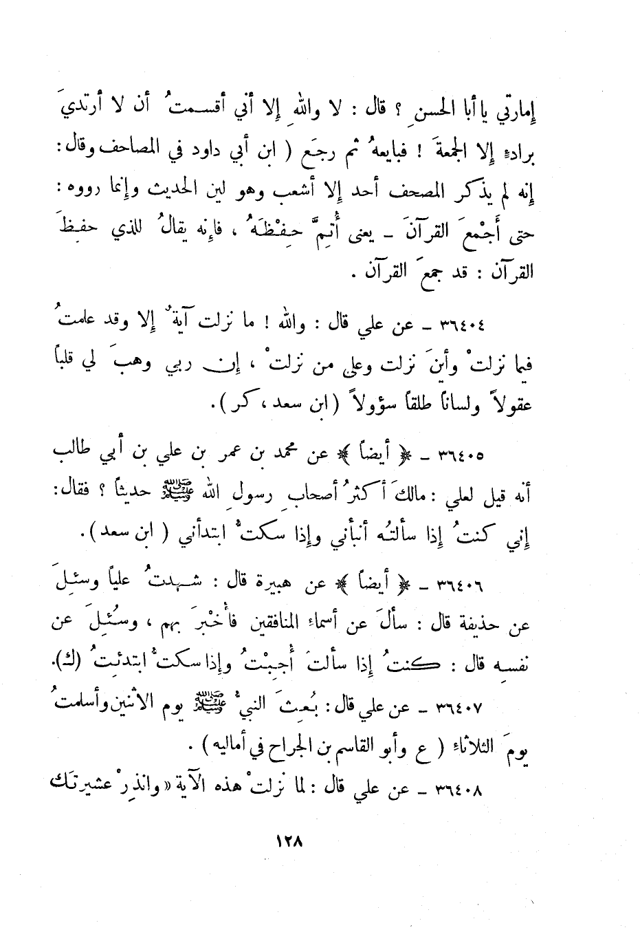 36404- عن علي قال: والله! ما نزلت آية إلا وقد علمت فيما نزلت وأين نزلت وعلى من نزلت، إن ربي وهب لي قلبا عقولا ولسانا طلقا سؤولا. ابن سعد، "كر".