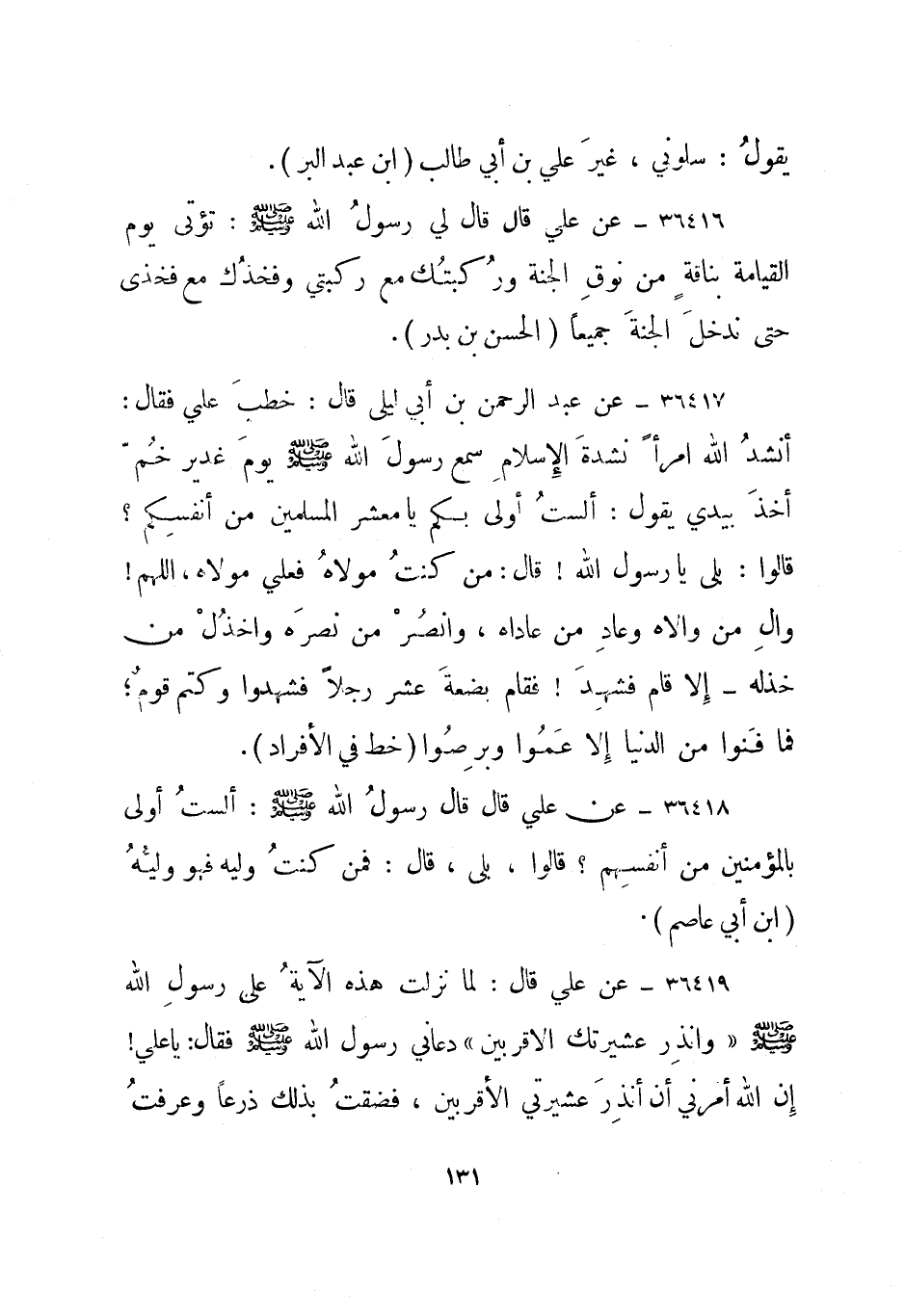 36418- عن علي قال قال رسول الله صلى الله عليه وسلم: ألست أولى بالمؤمنين من أنفسهم؟ قالوا: بلى، قال: فمن كنت وليه فهو وليه. "ابن أبي عاصم".