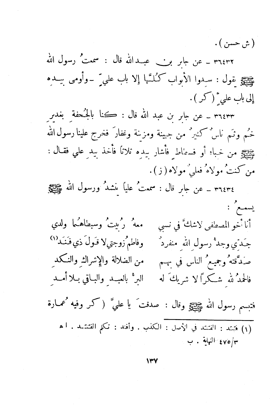 36433- عن جابر بن عبد الله قال: كنا بالجحفة بغدير خم وثم ناس كثير من جهينة ومزينة وغفار فخرج علينا رسول الله صلى الله عليه وسلم من خباء أو فسطاط فأشار بيده ثلاثا فأخذ بيد علي فقال: من كنت مولاه فعلي مولاه. "ز".