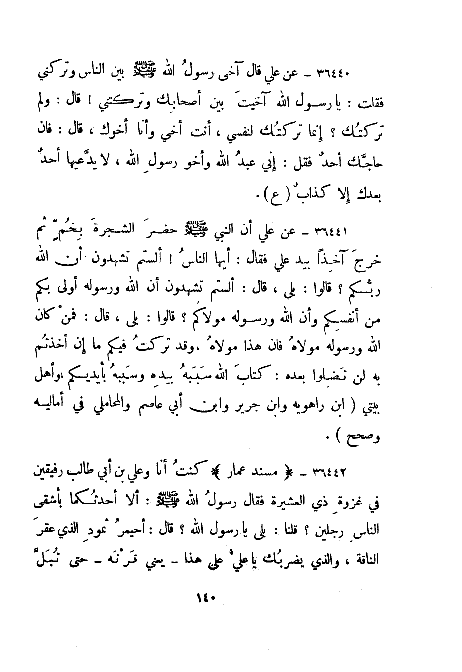 36441- عن علي أن النبي صلى الله عليه وسلم حضر الشجرة بخم ثم خرج آخذا بيد علي فقال: أيها الناس! ألستم تشهدون أن الله ربكم؟ قالوا: بلى، قال: ألستم تشهدون أن الله ورسوله أولى بكم من أنفسكم وأن الله ورسوله مولاكم؟ قالوا: بلى، قال: فمن كان الله ورسوله مولاه فإن هذا مولاه، وقد تركت فيكم ما إن أخذتم به لن تضلوا بعده: كتاب الله سببه بيده وسببه بأيديكم، وأهل بيتي.