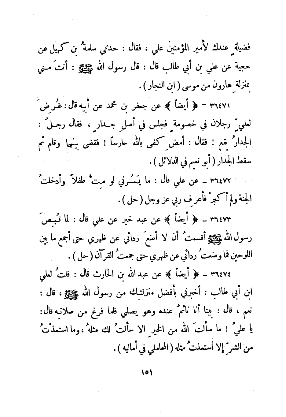 36474- "أيضا" عن عبد الله بن الحارث قال: قلت لعلي بن أبي طالب: أخبرني بأفضل منزلتك من رسول الله صلى الله عليه وسلم، قال: نعم، قال: بينا أنا نائم عنده وهو يصلي فلما فرغ من صلاته قال: يا علي! ما سألت الله من الخير إلا سألت لك مثله، وما استعذت من الشر إلا استعذت مثله. "المحاملي في أماليه".