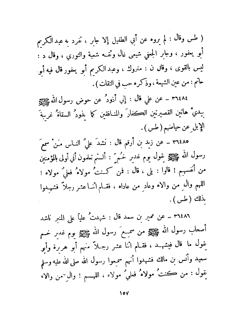 36485- عن زيد بن أرقم قال: نشد علي الناس من سمع رسول الله صلى الله عليه وسلم يقول يوم غدير خم: ألستم تعلمون أني أولى بالمؤمنين من أنفسهم! قالوا: بلى، قال: فمن كنت مولاه فعلي مولاه! اللهم وال من والاه وعاد من عاداه، فقام اثنا عشر رجلا فشهدوا بذلك. "طس".