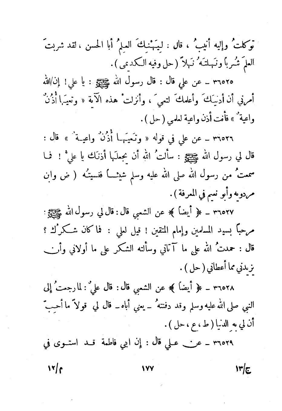 36527- "أيضا" عن الشعبي قال: قال لي رسول الله صلى الله عليه وسلم: مرحبا بسيد المسلمين وإمام المتقين! قيل لعلي: فما كان شكرك؟ قال: حمدت الله على ما آتاني وسألته الشكر على ما أولاني وأن يزيدني مما أعطاني. "حل".