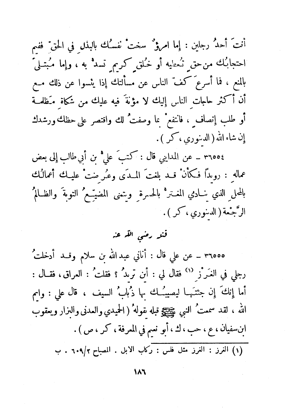 36554- عن المدايني قال: كتب علي بن أبي طالب إلى بعض عماله: رويدا فكأن قد بلغت المدى وعرضت عليك أعمالك بالمحل الذي ينادي المغتر بالحسرة ويتمنى المضيع التوبة والظالم الرجعة."الدينوري، كر".