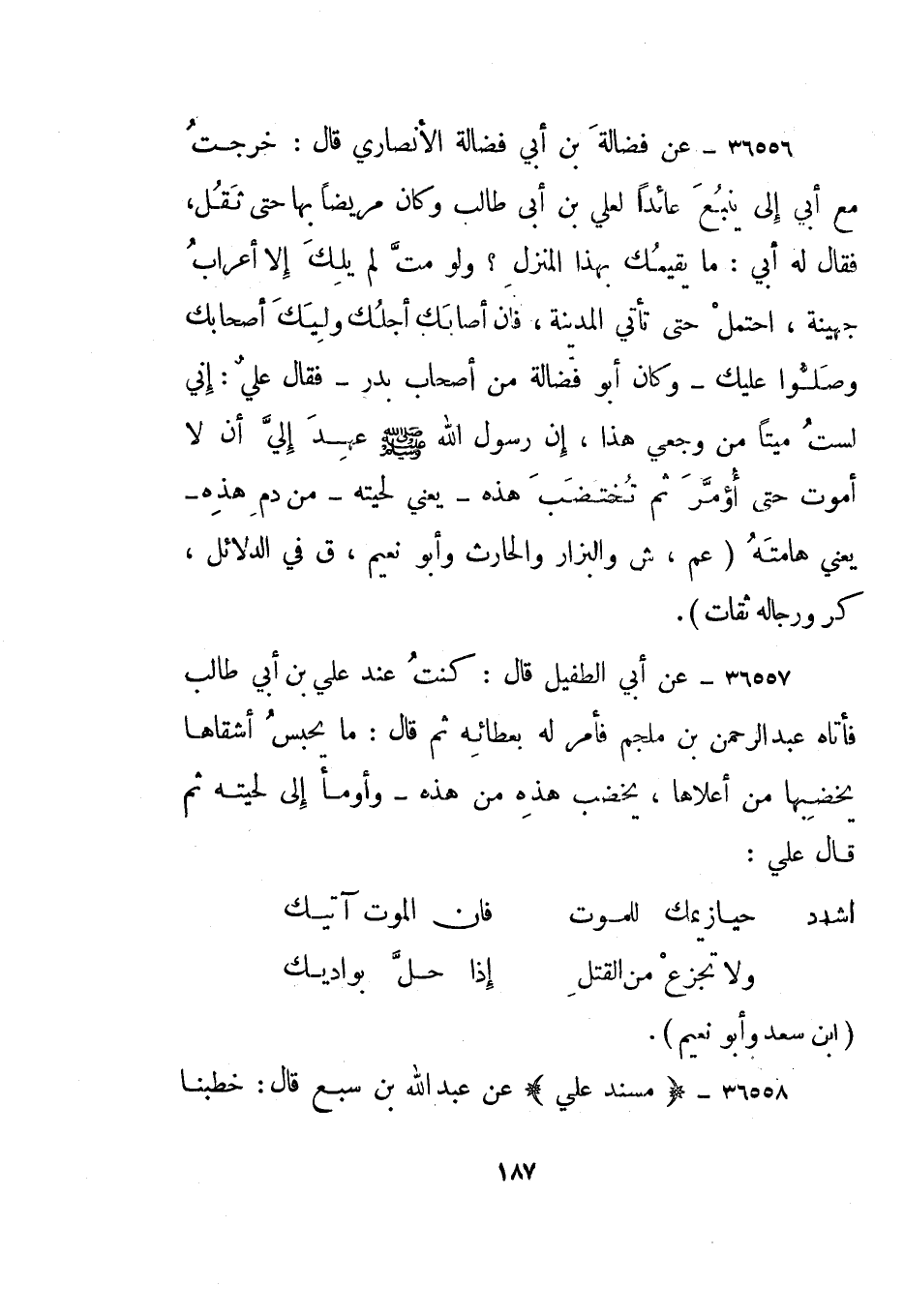 36557- عن أبي الطفيل قال: كنت عند علي بن أبي طالب فأتاه عبد الرحمن بن ملجم فأمر له بعطائه ثم قال: ما يحبس أشقاها يخضبها من أعلاها، يخضب هذه من هذه - وأومأ إلى لحيته ثم قال علي: