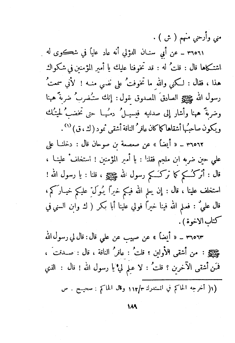 36561- عن أبي سنان الدؤلي أنه عاد عليا في شكوى له اشتكاها قال: قلت له: قد تخوفنا عليك يا أمير المؤمنين في شكواك هذا، فقال: لكني والله ما تخوفت على نفسي منه! لأني سمعت رسول الله صلى الله عليه وسلم الصادق المصدوق يقول: إنك ستضرب ضربة ههنا وضربة ههنا وأشار إلى صدغيه فيسيل دمها حتى تخضب لحيتك ويكون صاحبها أشقاها كما كان عاقر الناقة أشقى ثمود.
