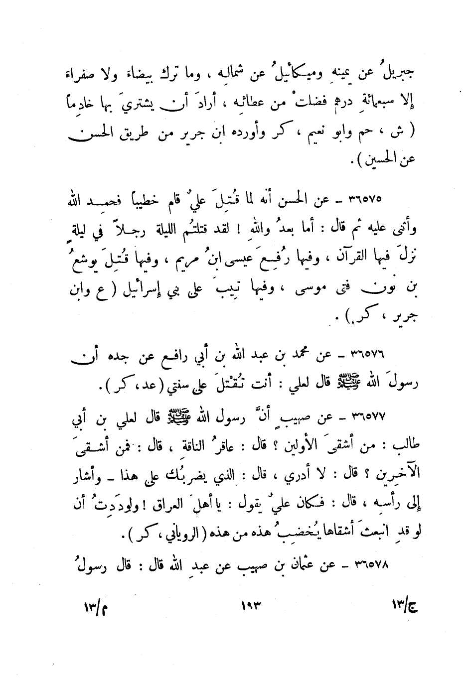 36575- عن الحسن أنه لما قتل علي قام خطيبا فحمد الله وأثنى عليه ثم قال: أما بعد والله! لقد قتلتم الليلة رجلا في ليلة نزل فيها القرآن، وفيها رفع عيسى ابن مريم، وفيها قتل يوشع بن نون فتى موسى، وفيها تيب على بني إسرائيل. "ع" وابن جرير، "كر".