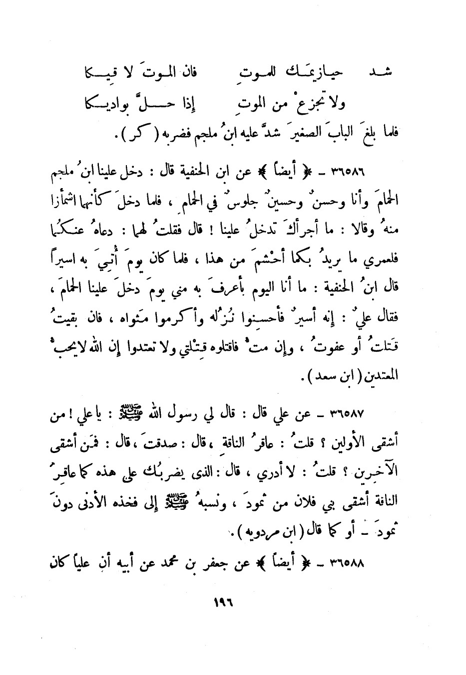 36586- "أيضا" عن ابن الحنفية قال: دخل علينا ابن ملجم الحمام وأنا وحسن وحسين جلوس في الحمام، فلما دخل كأنهما اشمأزا منه وقالا: ما أجرأك تدخل علينا! قال فقلت لهما: دعاه عنكما فلعمري ما يريد بكما أحشم من هذا، فلما كان يوم أتي به أسيرا قال ابن الحنفية: ما أنا اليوم بأعرف به مني يوم دخل علينا الحمام، فقال علي: إنه أسير فأحسنوا نزله وأكرموا مثواه، فإن بقيت قتلت أو عفوت، وإن مت فاقتلوه قتلتي ولا تعتدوا إن الله لا يحب المعتدين."ابن سعد".