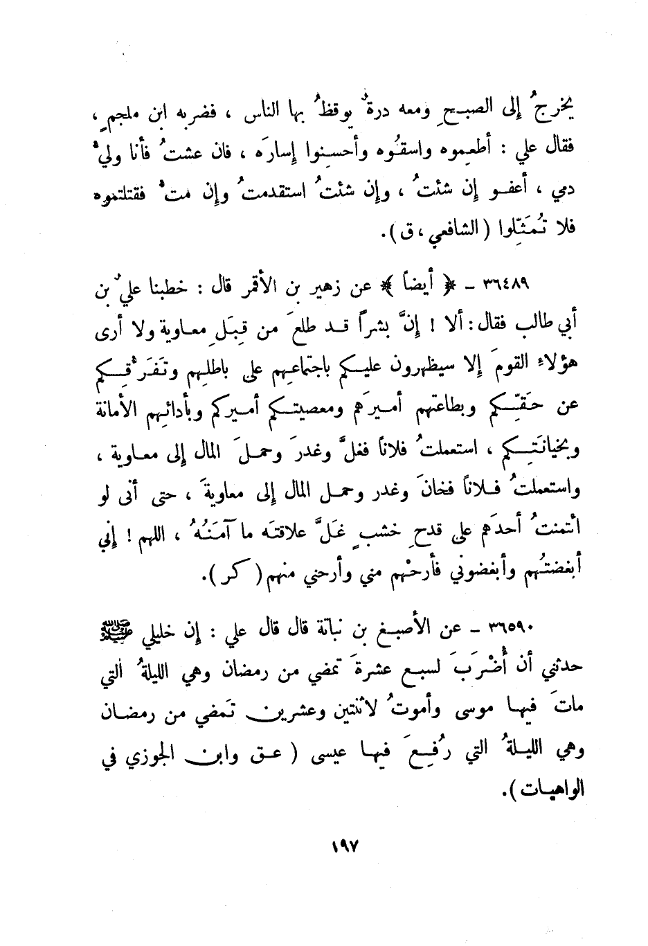 36590- عن الأصبغ بن نباتة قال قال علي: إن خليلي صلى الله عليه وسلم حدثني أن أضرب لسبع عشرة تمضي من رمضان وهي الليلة التي مات فيها موسى وأموت لاثنتين وعشرين تمضي من رمضان وهي الليلة التي رفع فيها عيسى. "عق" وابن الجوزي في الواهيات.