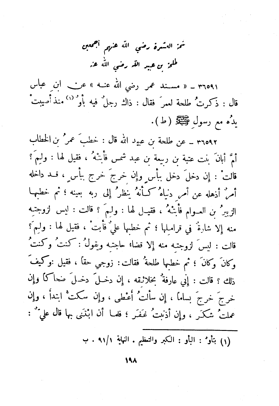 36591- "مسند عمر رضي الله عنه" عن ابن عباس قال: ذكرت طلحة لعمر فقال: ذاك رجل فيه بأو1 منذ أصيبت يده مع رسول الله صلى الله عليه وسلم. "ط".