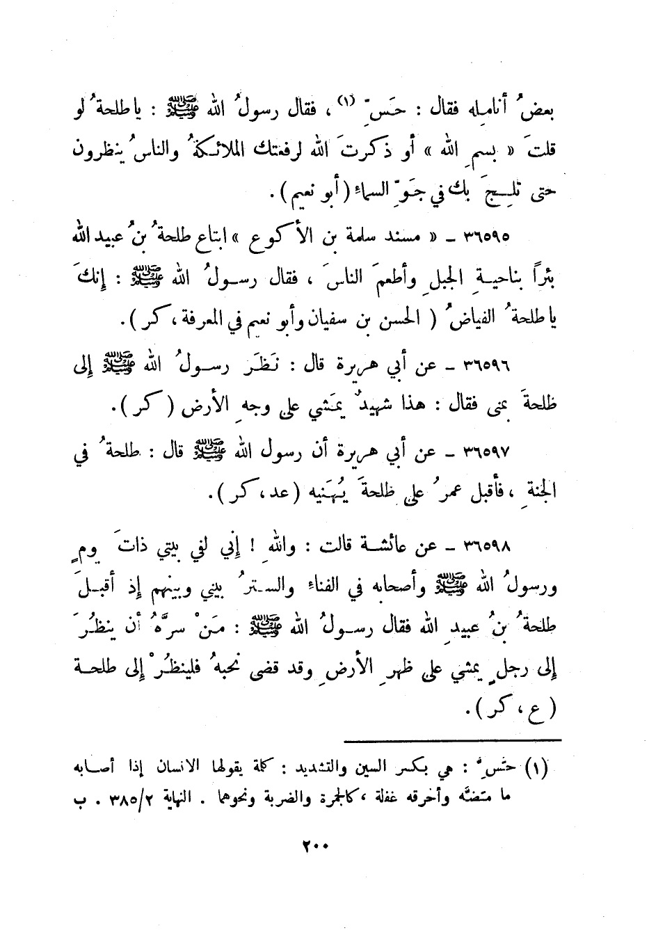 36596- عن أبي هريرة قال: نظر رسول الله صلى الله عليه وسلم إلى طلحة بمنى فقال: هذا شهيد يمشي على وجه الأرض. "كر".