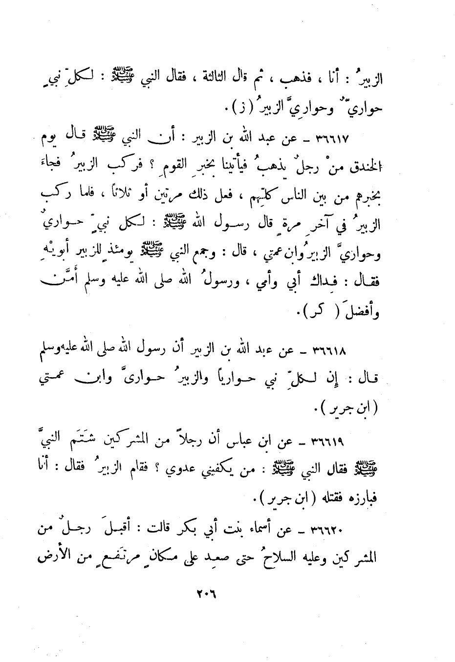 36619- عن ابن عباس أن رجلا من المشركين شتم النبي صلى الله عليه وسلم فقال النبي صلى الله عليه وسلم: من يكفيني عدوي؟ فقام الزبير فقال: أنا فبارزه فقتله. "ابن جرير".