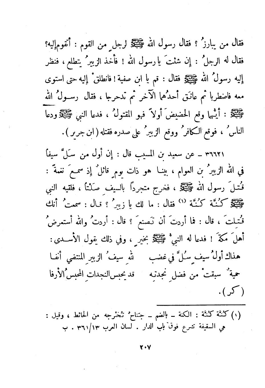36621- عن سعيد بن المسيب قال: إن أول من سل سيفا في الله الزبير ابن العوام، بينا هو ذات يوم قائل إذ سمع نغمة: قتل رسول الله صلى الله عليه وسلم، فخرج متجردا بالسيف صلتا، فلقيه النبي صلى الله عليه وسلم كنة كنة1 فقال: ما لك يا زبير؟ قال: سمعت أنك قتلت، قال: فما أردت أن تصنع؟ قال: أردت والله أستعرض أهل مكة! فدعا له النبي صلى الله عليه وسلم بخير، وفي ذلك يقول الأسدي: