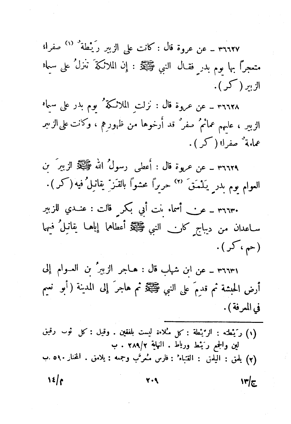 36627- عن عروة قال: كانت على الزبير ريطة1 صفراء متعجرا بها يوم بدر فقال النبي صلى الله عليه وسلم: إن الملائكة تنزل على سيماء الزبير. "كر".