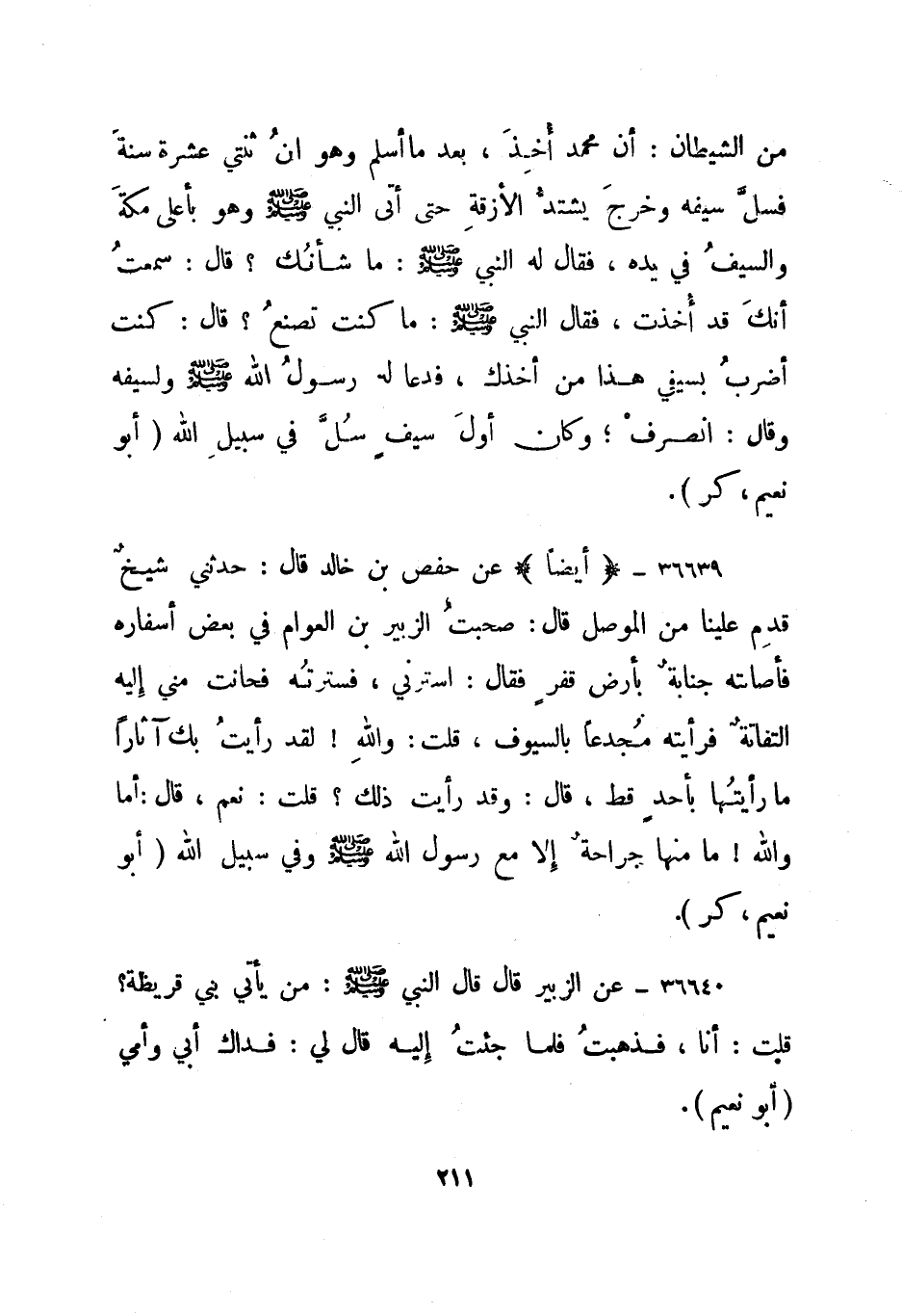 36639- "أيضا" عن حفص بن خالد قال: حدثني شيخ قدم علينا من الموصل قال: صحبت الزبير بن العوام في بعض أسفاره فأصابته جنابة بأرض قفر فقال: استرني، فسترته فحانت مني إليه التفاتة فرأيته مجدعا بالسيوف، قلت: والله! لقد رأيت بك آثارا ما رأيتها بأحد قط، قال: وقد رأيت ذلك؟ قلت: نعم، قال: أما والله! ما منها جراحة إلا مع رسول الله صلى الله عليه وسلم وفي سبيل الله.