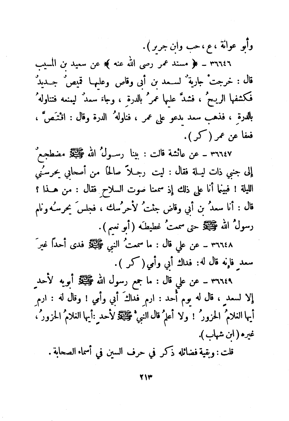 36649- عن علي قال: ما جمع رسول الله صلى الله عليه وسلم أبويه لأحد إلا لسعد، قال له يوم أحد: ارم فداك أبي وأمي! وقال له: ارم أيها الغلام الحزور! ولا أعلم قال النبي صلى الله عليه وسلم لأحد: أيها الغلام الحزور، غيره."ابن شهاب".