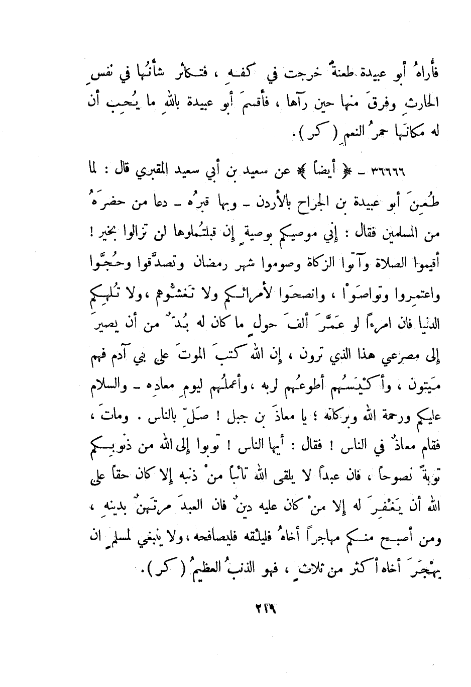 36666- "أيضا" عن سعيد بن أبي سعيد المقبري قال: لما طعن أبو عبيدة بن الجراح بالأردن - وبها قبره - دعا من حضره من المسلمين فقال: إني موصيكم بوصية إن قبلتموها لن تزالوا بخير! أقيموا الصلاة وآتوا الزكاة وصوموا شهر رمضان وتصدقوا وحجوا واعتمروا وتواصوا، وانصحوا لأمرائكم ولا تغشوهم، ولا تلهكم الدنيا فإن امرءا لو عمر ألف حول ما كان له بد من أن يصير إلى مصرعي هذا الذي ترون، إن الله كتب الموت على بني آدم فهم ميتون، وأكيسهم أطوعهم لربه، وأعملهم ليوم معاده - والسلام عليكم ورحمة الله وبركاته؛ يا معاذ بن جبل! صل بالناس. ومات، فقام معاذ في الناس! فقال: أيها الناس! توبوا إلى الله من ذنوبكم توبة نصوحا، فإن عبدا لا يلقى الله تائبا من ذنبه إلا كان حقا على الله أن يغفر له إلا من كان عليه دين فإن العبد مرتهن بدينه، ومن أصبح منكم مهاجرا أخاه فليلقه فليصافحه، ولا ينبغي لمسلم أن يهجر أخاه أكثر من ثلاث، فهو الذنب العظيم. "كر".