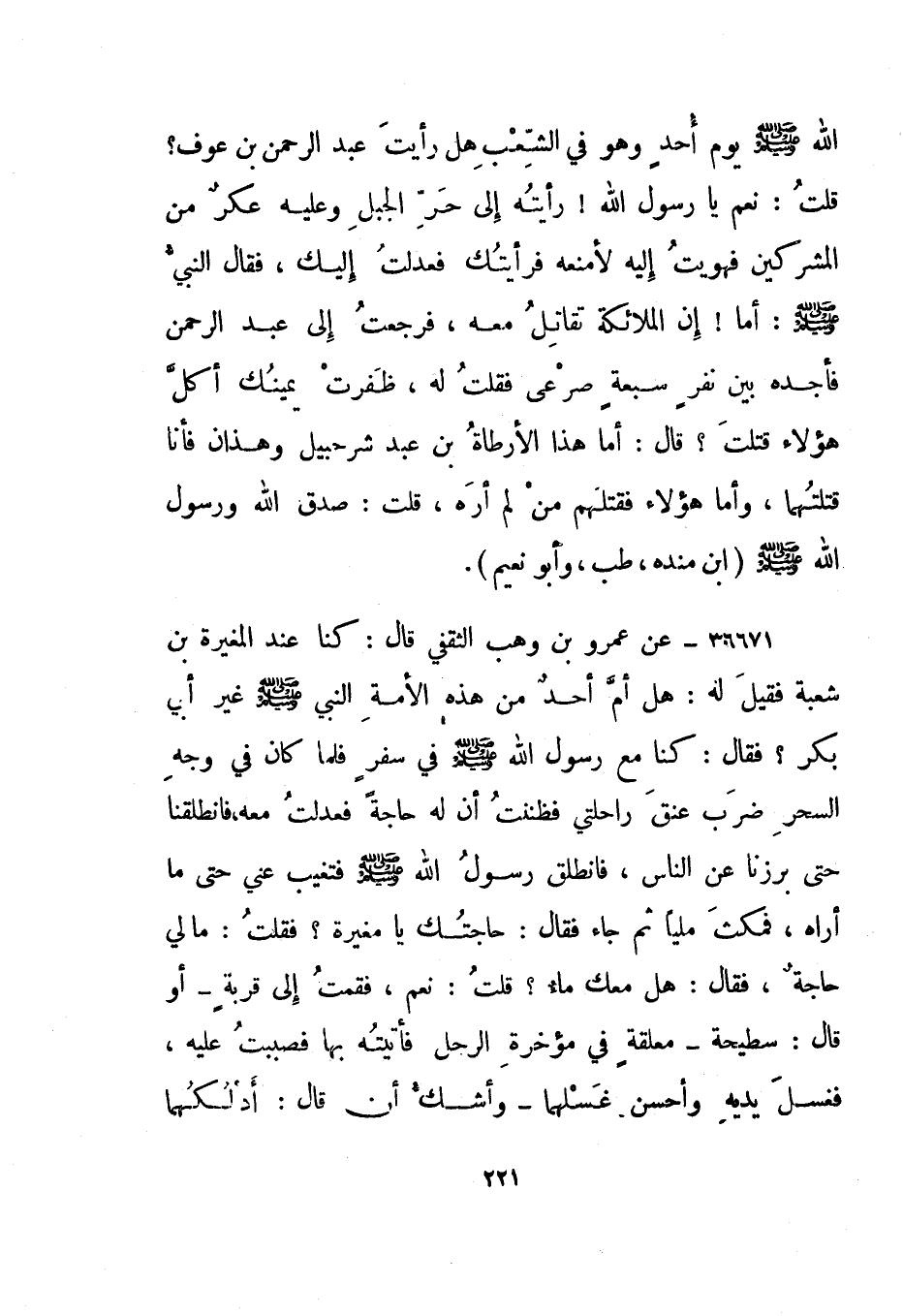 36671- عن عمرو بن وهب الثقفي قال: كنا عند المغيرة بن شعبة فقيل له: هل أم أحد من هذه الأمة النبي صلى الله عليه وسلم غير أبي بكر؟ فقال: كنا مع رسول الله صلى الله عليه وسلم في سفر فلما كان في وجه السحر ضرب عنق راحلتي فظننت أن له حاجة فعدلت معه، فانطلقنا حتى برزنا عن الناس، فانطلق رسول الله صلى الله عليه وسلم فتغيب عني حتى ما أراه، فمكث مليا ثم جاء فقال: حاجتك يا مغيرة؟ فقلت: ما لي حاجة، فقال: هل معك ماء؟ قلت: نعم، فقمت إلى قربة - أو قال: سطيحة - معلقة في مؤخرة الرحل فأتيته بها فصببت عليه، فغسل يديه وأحسن غسلهما - وأشك أن قال: أدلكهما