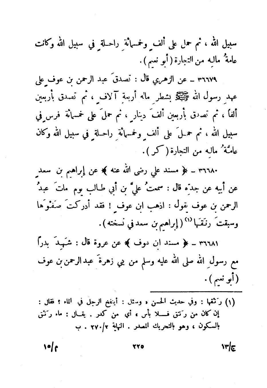 36679- عن الزهري قال: تصدق عبد الرحمن بن عوف على عهد رسول الله صلى الله عليه وسلم بشطر ماله أربعة آلاف، ثم تصدق بأربعين ألفا، ثم تصدق بأربعين ألفا دينار، ثم حمل على خمسمائة فرس في سبيل الله، ثم حمل على ألف وخمسمائة راحلة في سبيل الله وكان عامة ماله من التجارة. "كر".
