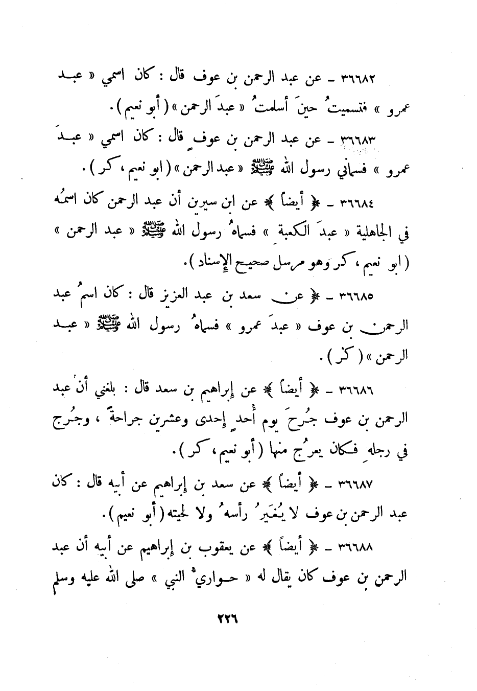 36682- عن عبد الرحمن بن عوف قال: كان اسمي "عبد عمرو" فتسميت حين أسلمت "عبد الرحمن".أبو نعيم.