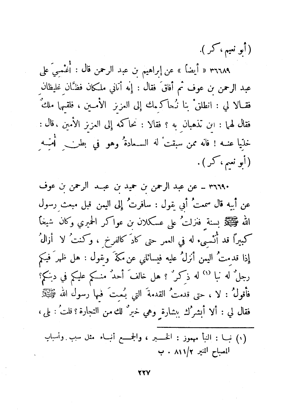 36690- عن عبد الرحمن بن حميد بن عبد الرحمن بن عوف عن أبيه قال سمعت أبي يقول: سافرت إلى اليمن قبل مبعث رسول الله صلى الله عليه وسلم بسنة فنزلت على عسكلان بن عواكر الحميري وكان شيخا كبيرا قد أنسئ له في العمر حتى كاد كالفرخ، وكنت لا أزال إذا قدمت اليمن أنزل عليه فيسائلني عن مكة ويقول: هل ظهر فيكم رجل له نبا1 له ذكر؟ هل خالف أحد منكم عليكم في دينكم؟ فأقول: لا، حتى قدمت القدمة التي بعث فيها رسول الله صلى الله عليه وسلم فقال لي: ألا أبشرك ببشارة وهي خير لك من التجارة؟ قلت: بلى،