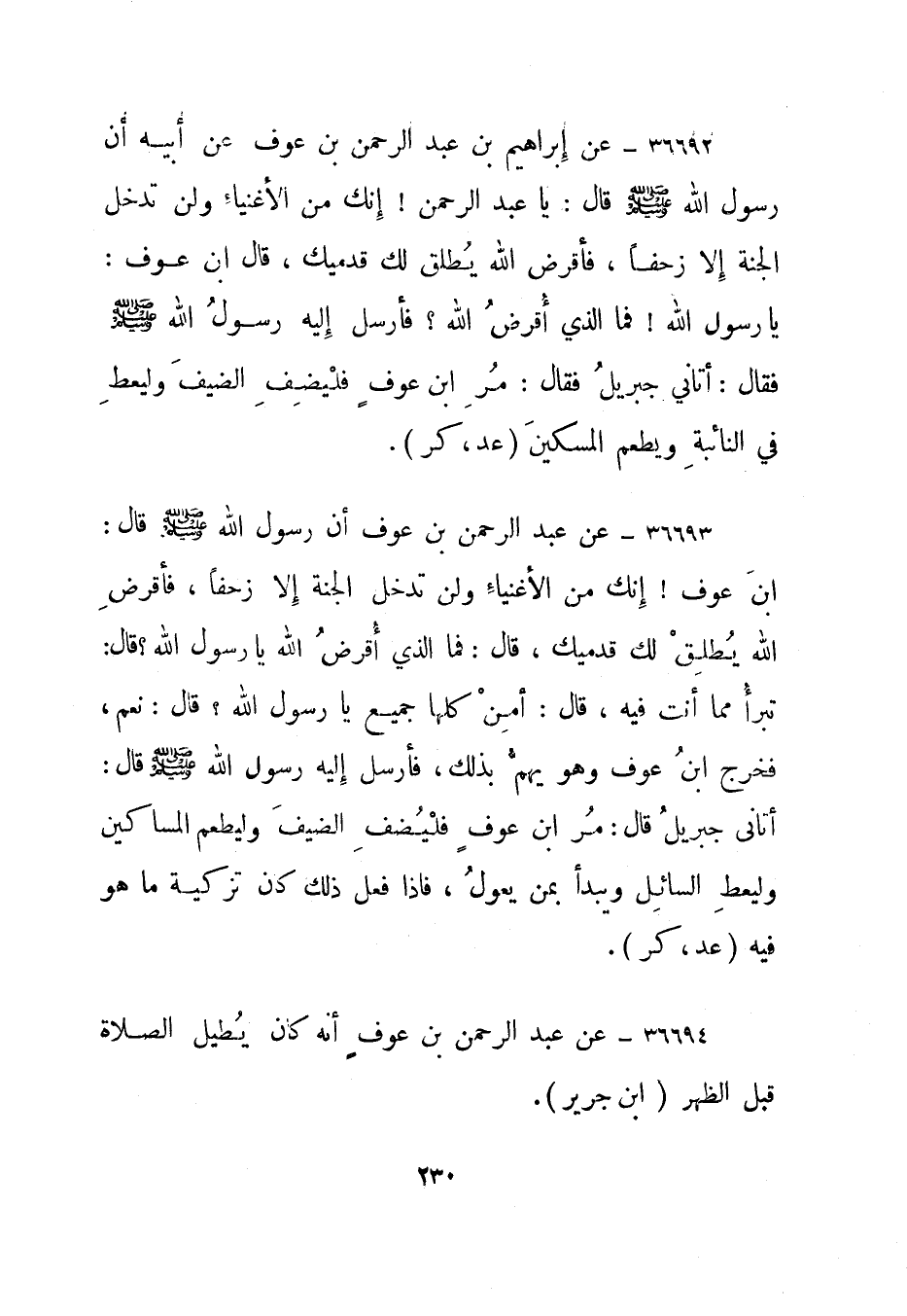 36693- عن عبد الرحمن بن عوف أن رسول الله صلى الله عليه وسلم قال: ابن عوف! إنك من الأغنياء ولن تدخل الجنة إلا زحفا، فأقرض الله يطلق لك قدميك، قال: فما الذي أقرض الله يا رسول الله؟ قال: تبرأ مما أنت فيه، قال: أمن كلها جميع يا رسول الله؟ قال: نعم، فخرج ابن عوف وهو يهم بذلك، فأرسل إليه رسول الله صلى الله عليه وسلم قال: أتاني جبريل قال: مر ابن عوف فليضف الضيف وليطعم المساكين وليعط السائل ويبدأ بمن يعول، فإذا فعل ذلك كان تزكية ما هو فيه. "عد، كر".