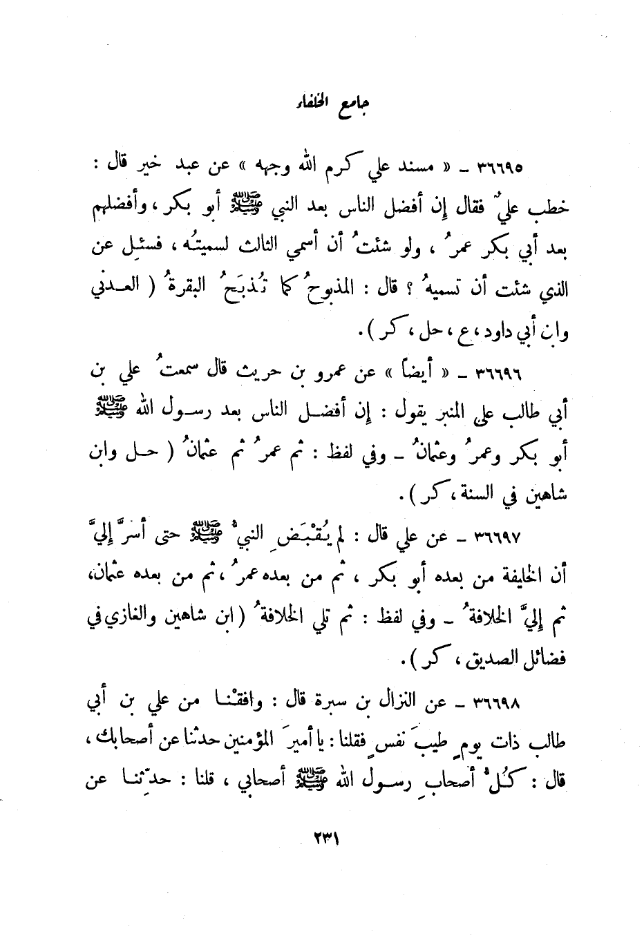 36695- "مسند علي كرم الله وجهه" عن عبد خير قال: خطب علي فقال إن أفضل الناس بعد النبي صلى الله عليه وسلم أبو بكر، وأفضلهم بعد أبي بكر عمر، ولو شئت أن أسمي الثالث لسميته، فسئل عن الذي شئت أن تسميه؟ قال: المذبوح كما تذبح البقرة. العدني وابن أبي داود، "ع، حل، كر".
