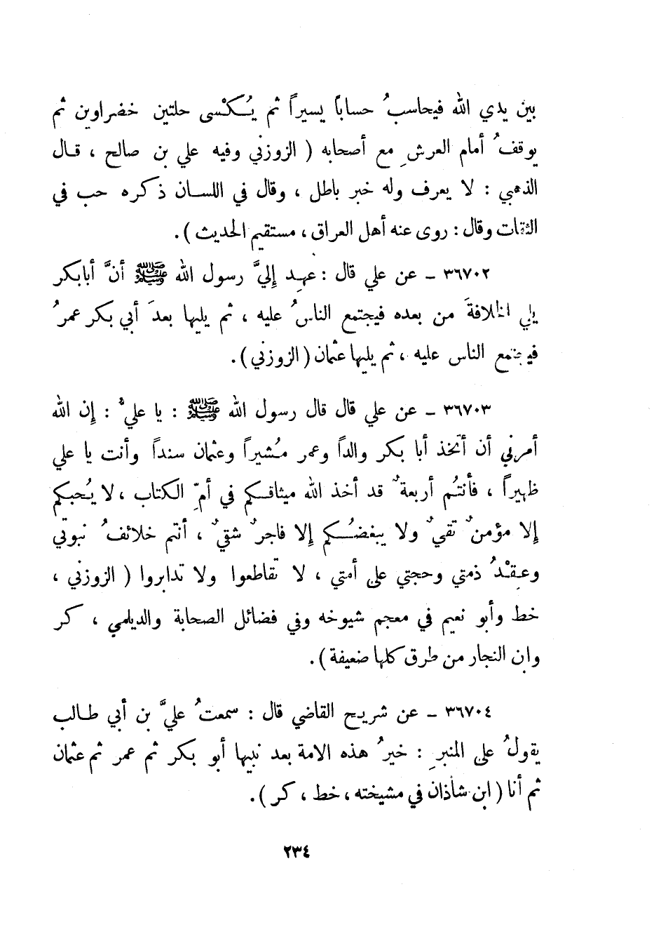 36702- عن علي قال: عهد إلي رسول الله صلى الله عليه وسلم أن أبا بكر يلي الخلافة من بعده فيجتمع الناس عليه، ثم يليها بعد أبي بكر عمر فيجتمع الناس عليه، ثم يليها عثمان."الزوزني".