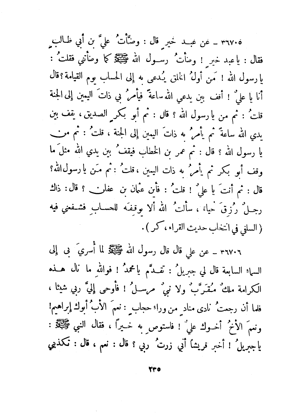 36705- عن عبد خير قال: وضأت علي بن أبي طالب فقال: يا عبد خير! وضأت رسول الله صلى الله عليه وسلم كما وضأتني فقلت: يا رسول الله! من أول الخلق يدعى به إلى الحساب يوم القيامة؟ قال أنا يا علي! أقف بين يدي الله ساعة فيأمر بي ذات اليمين إلى الجنة قلت: ثم من يا رسول الله؟ قال: ثم أبو بكر الصديق، يقف بين يدي الله ساعة ثم يأمر به ذات اليمين إلى الجنة، قلت: ثم من يا رسول الله؟ قال: ثم عمر بن الخطاب فيقف بين يدي الله مثل ما وقف أبو بكر ثم يأمر به ذات اليمين، قلت: ثم من يا رسول الله؟ قال: ثم أنت يا علي! قلت: فأين عثمان بن عفان؟ قال: ذاك رجل رزق حياء، سألت الله ألا يوقفه للحساب فشفعني فيه. "السلفي في انتخاب حديث القراء، كر".