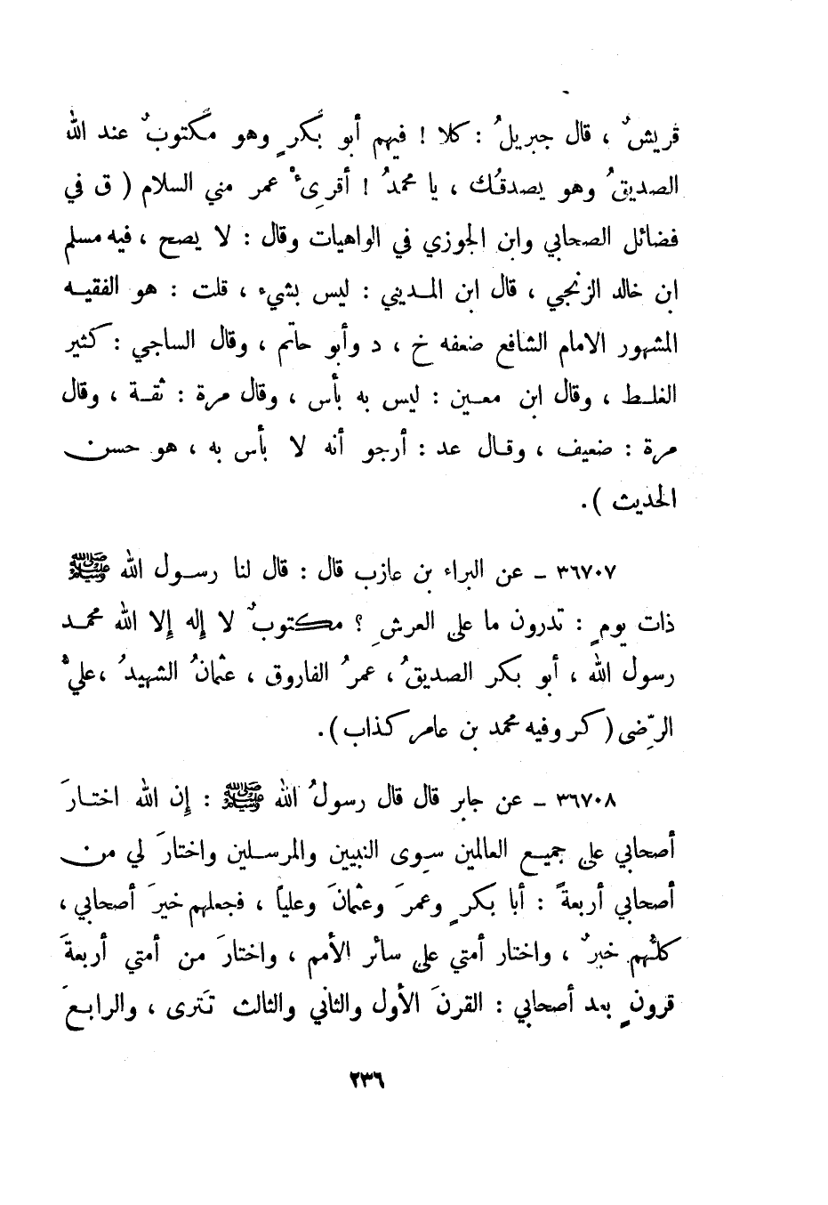 36708- عن جابر قال قال رسول الله صلى الله عليه وسلم: إن الله اختار أصحابي على جميع العالمين سوى النبيين والمرسلين واختار لي من أصحابي أربعة: أبا بكر وعمر وعثمان وعليا، فجعلهم خير أصحابي، كلهم خير، واختار أمتي على سائر الأمم، واختار من أمتي أربعة قرون بعد أصحابي: القرن الأول والثاني والثالث تترى، والرابع