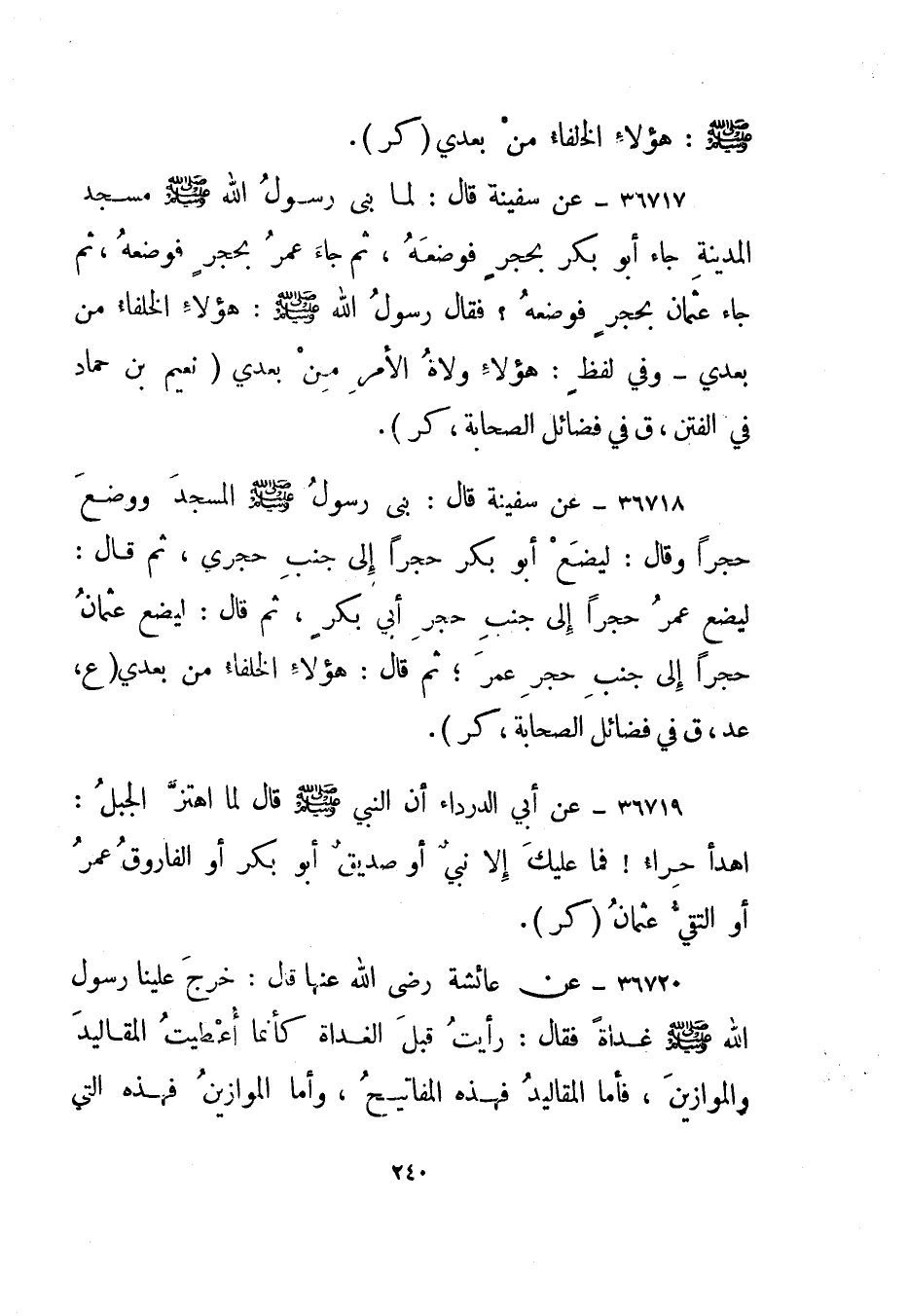 36717- عن سفينة قال: لما بنى رسول الله صلى الله عليه وسلم مسجد المدينة جاء أبو بكر بحجر فوضعه، ثم جاء عمر بحجر فوضعه، ثم جاء عثمان بحجر فوضعه؟ فقال رسول الله صلى الله عليه وسلم: هؤلاء الخلفاء من بعدي - وفي لفظ: هؤلاء ولاة الأمر من بعدي.نعيم بن حماد في الفتن، "ق" في فضائل الصحابة، "كر".
