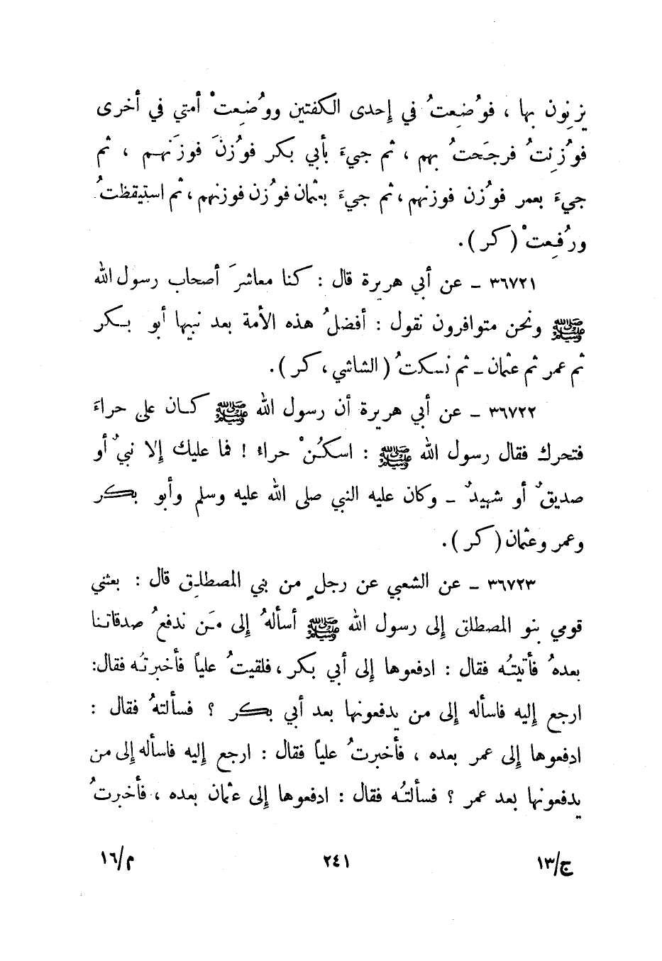 36721- عن أبي هريرة قال: كنا معاشر أصحاب رسول الله صلى الله عليه وسلم ونحن متوافرون نقول: أفضل هذه الأمة بعد نبيها أبو بكر ثم عمر ثم عثمان - ثم نسكت. الشاشي، "كر".
