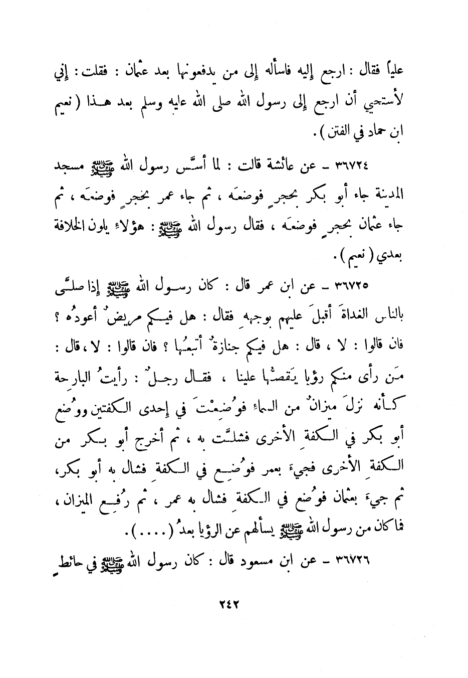 36725- عن ابن عمر قال: كان رسول الله صلى الله عليه وسلم إذا صلى بالناس الغداة أقبل عليهم بوجهه فقال: هل فيكم مريض أعوده؟ فإن قالوا: لا، قال: هل فيكم جنازة أتبعها؟ فإن قالوا: لا، قال: من رأى منكم رؤيا يقصها علينا، فقال رجل: رأيت البارحة كأنه نزل ميزان من السماء فوضعت في إحدى الكفتين ووضع أبو بكر في الكفة الأخرى فشلت به، ثم أخرج أبو بكر من الكفة الأخرى فجيء بعمر فوضع في الكفة فشال به أبو بكر، ثم جيء بعثمان فوضع في الكفة فشال به عمر، ثم رفع الميزان، فما كان من رسول الله صلى الله عليه وسلم يسألهم عن الرؤيا بعد. " ... ".