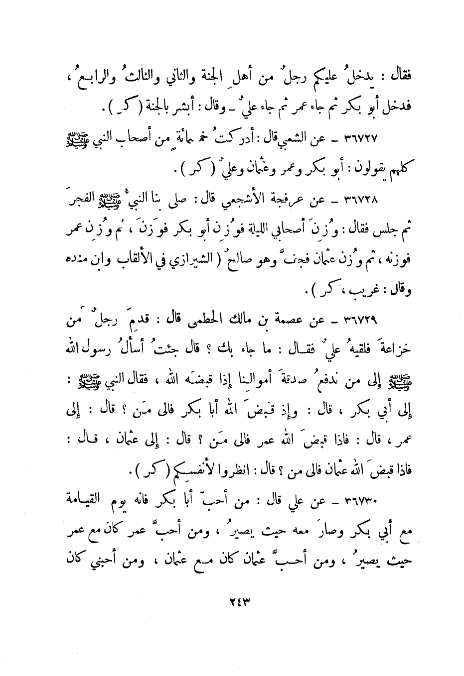 36727- عن الشعبي قال: أدركت خمسمائة من أصحاب النبي صلى الله عليه وسلم كلهم يقولون: أبو بكر وعمر وعثمان وعلي. "كر".