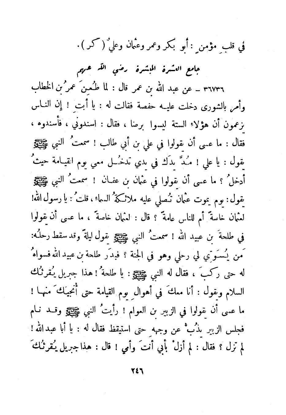 36736- عن عبد الله بن عمر قال: لما طعن عمر بن الخطاب وأمر بالشورى دخلت عليه حفصة فقالت له: يا أبت! إن الناس يزعمون أن هؤلاء الستة ليسوا برضا، فقال: اسندوني، فأسندوه، فقال: ما عسى أن يقولوا في علي بن أبي طالب! سمعت النبي صلى الله عليه وسلم يقول: يا علي! مد يدك في يدي تدخل معي يوم القيامة حيث أدخل؟ ما عسى أن يقولوا في عثمان بن عفان! سمعت النبي صلى الله عليه وسلم يقول: يوم يموت عثمان تصلي عليه ملائكة السماء، قلت: يا رسول الله! لعثمان خاصة أم للناس عامة؟ قال: لعثمان خاصة، ما عسى أن يقولوا في طلحة بن عبيد الله! سمعت النبي صلى الله عليه وسلم يقول ليلة وقد سقط رحله: من يسوي لي رحلي وهو في الجنة؟ فبدر طلحة بن عبيد الله فسواه له حتى ركب، فقال له النبي صلى الله عليه وسلم: يا طلحة! هذا جبريل يقرئك السلام ويقول: أنا معك في أهوال يوم القيامة حتى أنجيك منها! ما عسى أن يقولوا في الزبير بن العوام! رأيت النبي صلى الله عليه وسلم وقد نام فجلس الزبير يذب عن وجهه حتى استيقظ فقال له: يا أبا عبد الله! لم تزل؟ فقال: لم أزل بأبي أنت وأمي! قال: هذا جبريل يقرئك