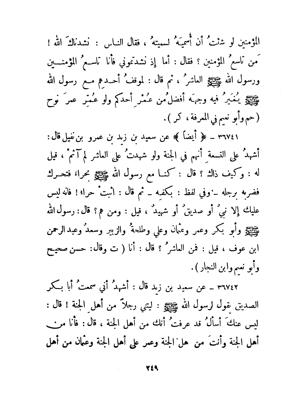36742- عن سعيد بن زيد قال: أشهد أني سمعت أبا بكر الصديق يقول لرسول الله صلى الله عليه وسلم: ليتني رجلا من أهل الجنة! قال: ليس عنك أسأل قد عرفت أنك من أهل الجنة، قال: فأنا من أهل الجنة وأنت من أهل الجنة وعمر على؟؟؟ "من" أهل الجنة وعثمان من أهل