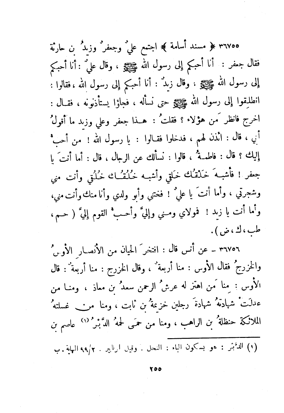 36755- "مسند أسامة" اجتمع علي وجعفر وزيد بن حارثة فقال جعفر: أنا أحبكم إلى رسول الله صلى الله عليه وسلم، وقال علي: أنا أحبكم إلى رسول الله صلى الله عليه وسلم، وقال زيد: أنا أحبكم إلى رسول الله، فقالوا: انطلقوا إلى رسول الله صلى الله عليه وسلم حتى نسأله، فجاؤوا يستأذنونه، فقال: اخرج فانظر من هؤلاء؟ فقلت: هذا جعفر وعلي وزيد ما أقول أبي، قال: ائذن لهم، فدخلوا فقالوا: يا رسول الله! من أحب إليك؟ قال: فاطمة، قالوا: نسألك عن الرجال، قال: أما أنت يا جعفر! فأشبه خلقك خلقي وأشبه خلقك خلقي وأنت مني وشجرتي، وأما أنت يا علي! فختني وأبو ولدي وأنا منك وأنت مني، وأما أنت يا زيد! فمولاي ومني وإلي وأحب القوم إلي.