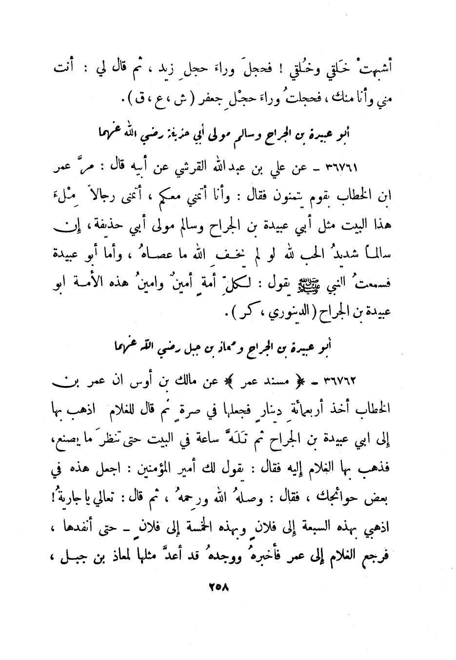 36762-"مسند عمر" عن مالك بن أوس أن عمر بن الخطاب أخذ أربعمائة دينار فجعلها في صرة ثم قال للغلام اذهب بها إلى أبي عبيدة بن الجراح ثم تله ساعة في البيت حتى تنظر ما يصنع، فذهب بها الغلام إليه فقال: يقول لك أمير المؤمنين: اجعل هذه في بعض حوائجك، فقال: وصله الله ورحمه، ثم قال: تعالي يا جارية! اذهبي بهذه السبعة إلى فلان وبهذه الخمسة إلى فلان - حتى أنفدها، فرجع الغلام إلى عمر فأخبره ووجده قد أعد مثلها لمعاذ بن جبل،