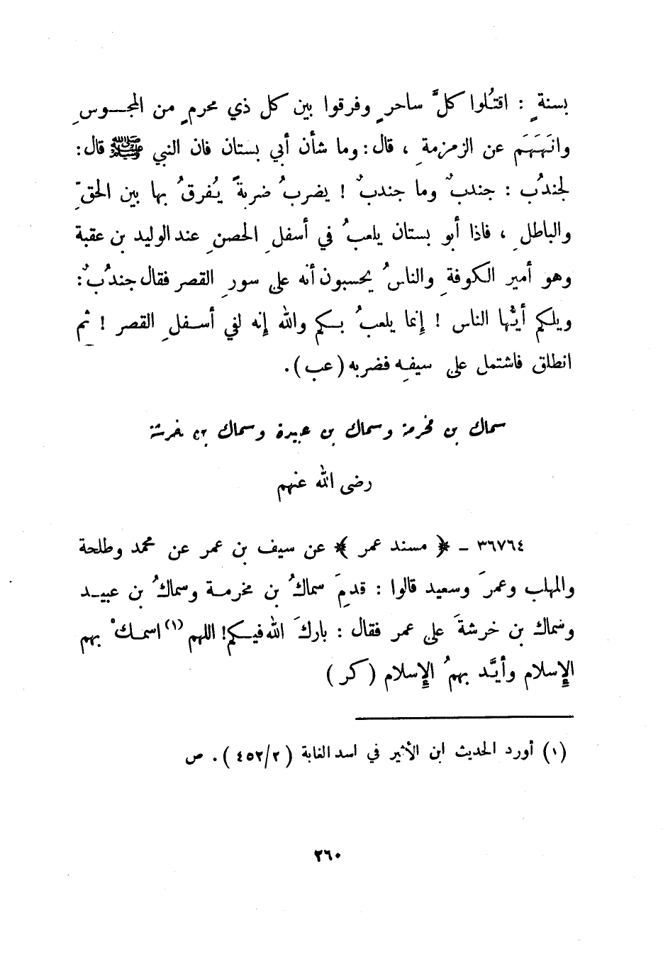 بسنة: اقتلوا كل ساحر وفرقوا بين كل ذي محرم من المجوس وانههم عن الزمزمة، قال: وما شأن أبي بستان فإن النبي صلى الله عليه وسلم قال: لجندب: جندب وما جندب! يضرب ضربة يفرق بها بين الحق والباطل، فإذا أبو بستان يلعب في أسفل الحصن عند الوليد بن عقبة وهو أمير الكوفة والناس يحسبون أنه على سور القصر فقال جندب: ويلكم أيها الناس! إنما يلعب بكم والله إنه لفي أسفل القصر! ثم انطلق فاشتمل على سيفه فضربه. "عب".