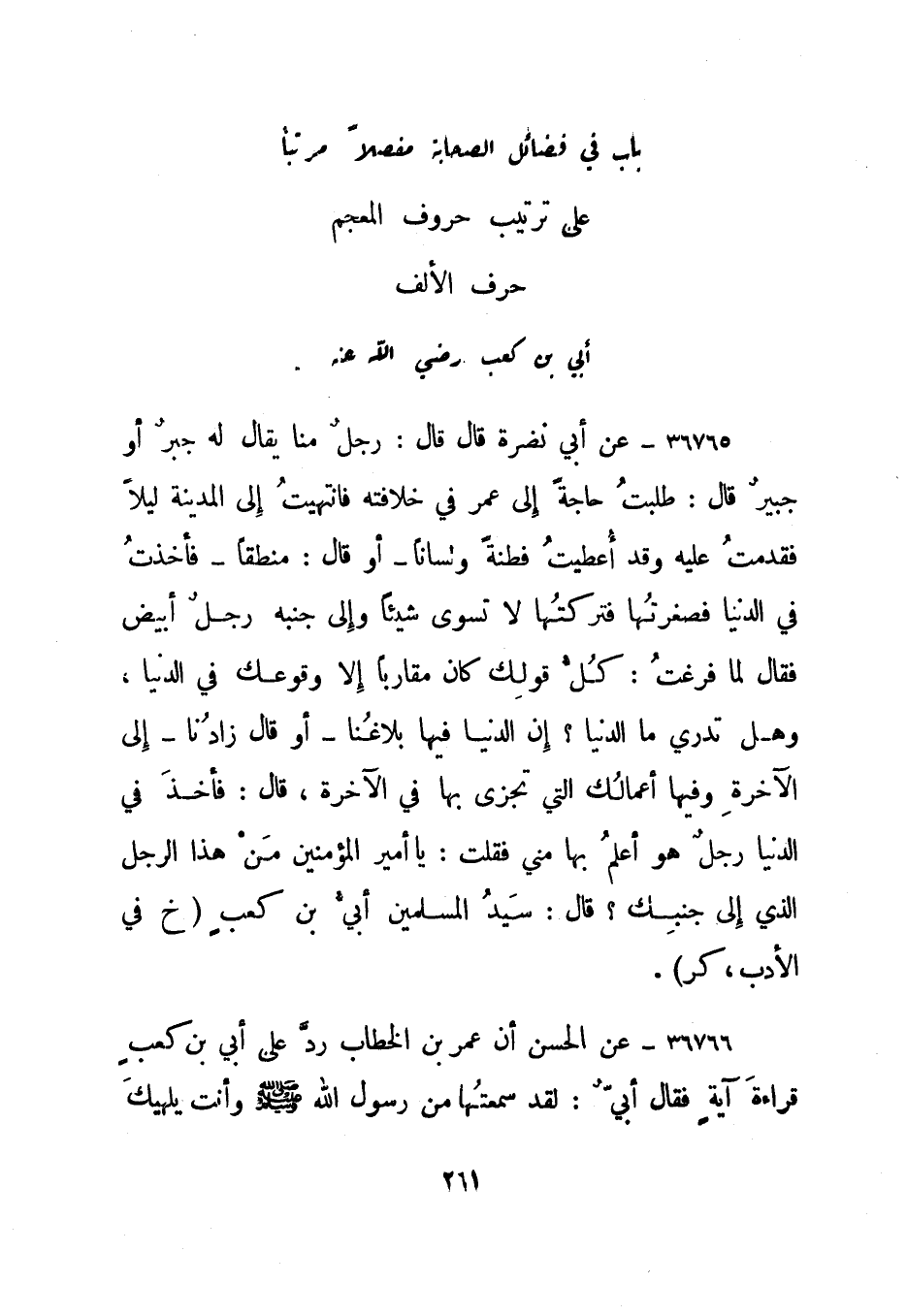 36765- عن أبي نضرة قال قال: رجل منا يقال له جبر أو جبير قال: طلبت حاجة إلى عمر في خلافته فانتهيت إلى المدينة ليلا فقدمت عليه وقد أعطيت فطنة ولسانا - أو قال: منطقا - فأخذت في الدنيا فصغرتها فتركتها لا تسوى شيئا وإلى جنبه رجل أبيض فقال لما فرغت: كل قولك كان مقاربا إلا وقوعك في الدنيا، وهل تدري ما الدنيا؟ إن الدنيا فيها بلاغنا - أو قال زادنا - إلى الآخرة وفيها أعمالك التي تجزى بها في الآخرة، قال: فأخذ في الدنيا رجل هو أعلم بها مني فقلت: يا أمير المؤمنين من هذا الرجل الذي إلى جنبك؟ قال: سيد المسلمين أبي بن كعب. "خ" في الأدب، "كر".