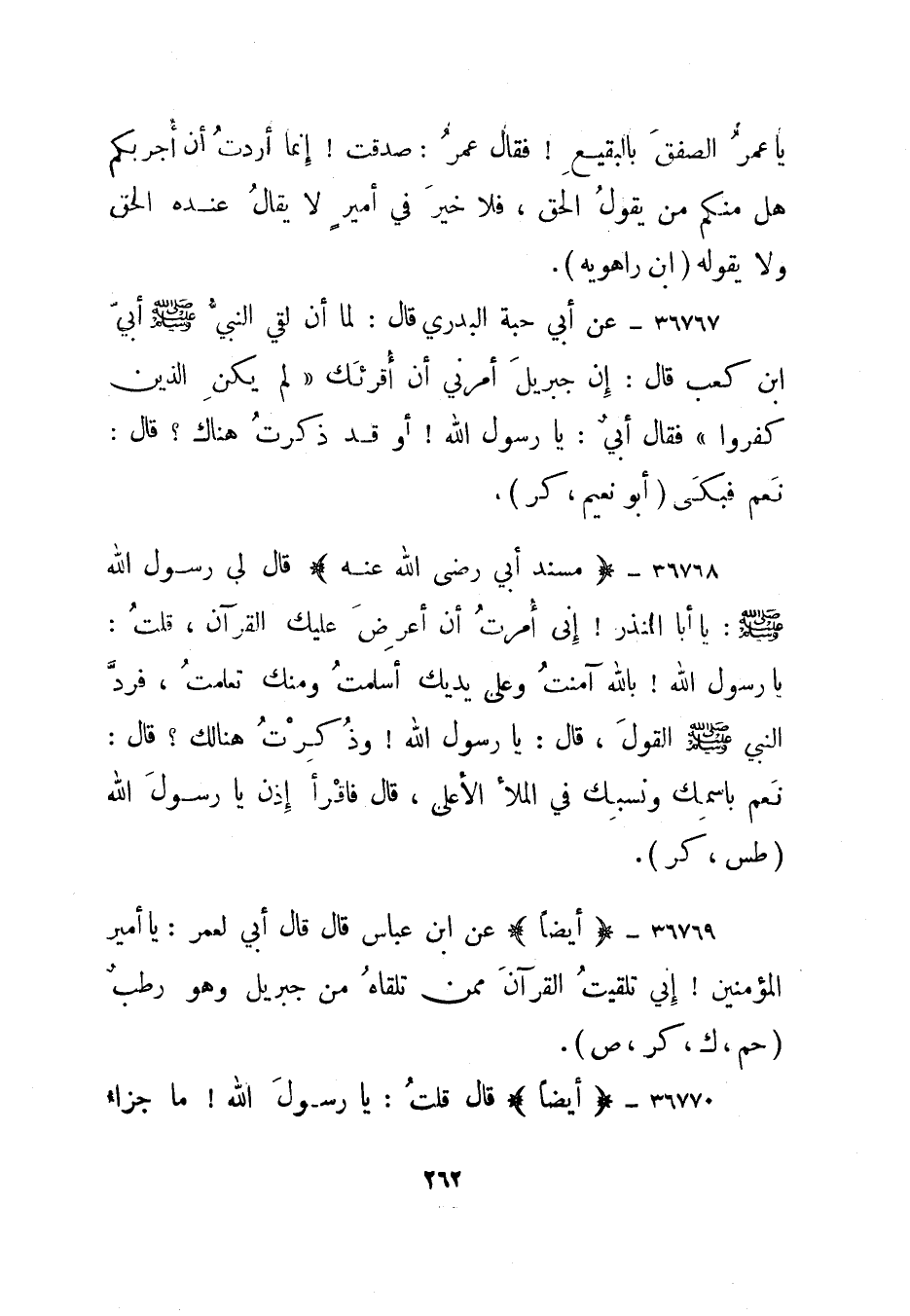 36767- عن أبي حبة البدري قال: لما أن لقي النبي صلى الله عليه وسلم أبي بن كعب قال: إن جبريل أمرني أن أقرئك "لم يكن الذين كفروا" فقال أبي: يا رسول الله! أو قد ذكرت هناك؟ قال: نعم فبكى. أبو نعيم، "كر".