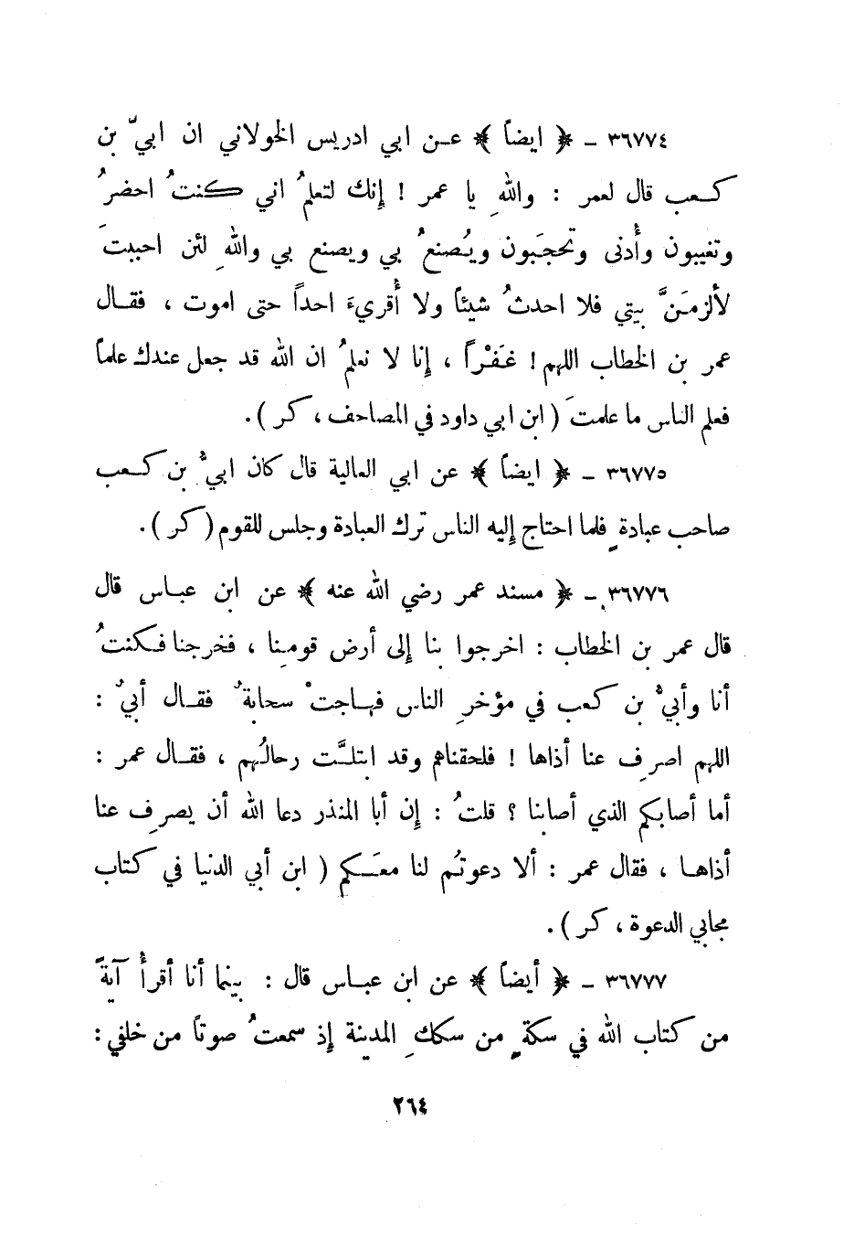 36776- "مسند عمر رضي الله عنه" عن ابن عباس قال قال عمر بن الخطاب: اخرجوا بنا إلى أرض قومنا، فخرجنا فكنت أنا وأبي بن كعب في مؤخر الناس فهاجت سحابة فقال أبي: اللهم اصرف عنا أذاها! فلحقناهم وقد ابتلت رحالهم، فقال عمر: أما أصابكم الذي أصابنا؟ قلت: إن أبا المنذر دعا الله أن يصرف عنا أذاها، فقال عمر: ألا دعوتم لنا معكم."ابن أبي الدنيا في كتاب مجابي الدعوة كر".
