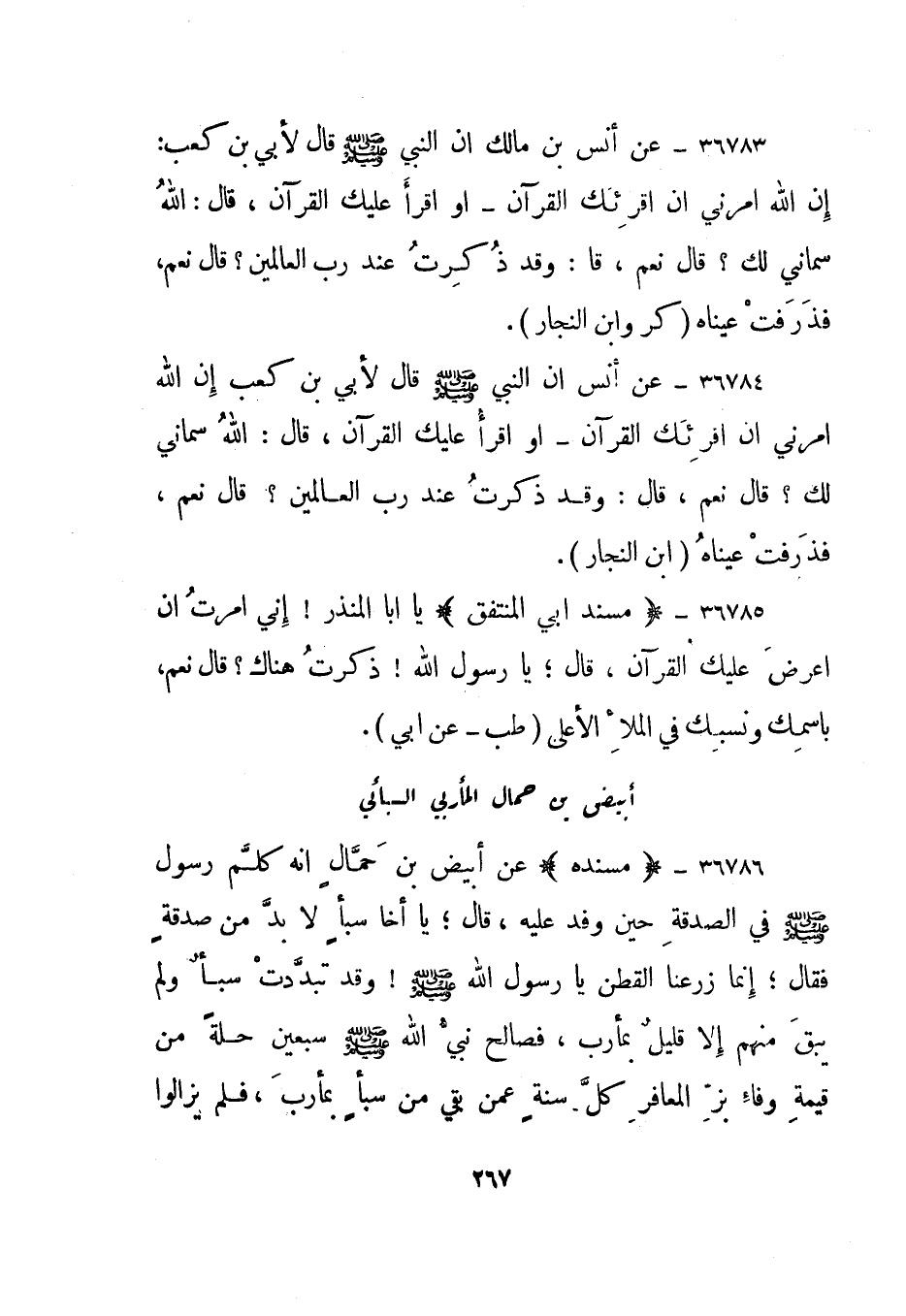 36785- "مسند أبي المنتفق" يا أبا المنذر! إني أمرت أن أعرض عليك القرآن، قال: يا رسول الله! ذكرت هناك؟ قال: نعم، باسمك ونسبك في الملأ الأعلى. "طب" - عن أبي.