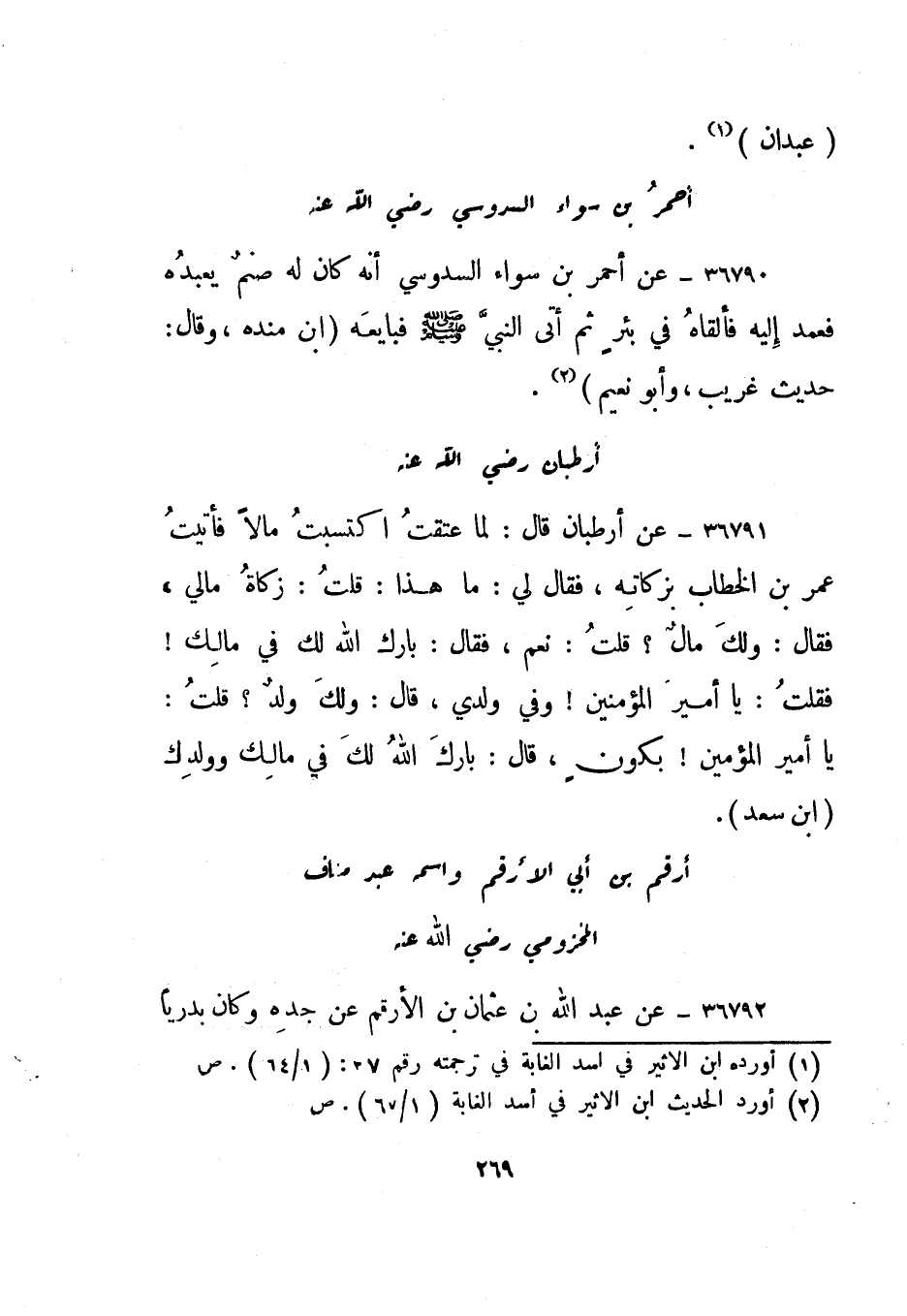 36791- عن أرطبان قال: لما عتقت اكتسبت مالا فأتيت عمر بن الخطاب بزكاته، فقال لي: ما هذا؟ قلت: زكاة مالي، فقال: ولك مال؟ قلت: نعم، فقال: بارك الله لك في مالك! فقلت: يا أمير المؤمنين! وفي ولدي، قال: ولك ولد؟ قلت: يا أمير المؤمنين! يكون، قال: بارك الله لك في مالك وولدك."ابن سعد".