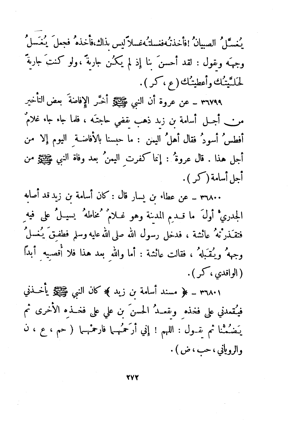 36800- عن عطاء بن يسار قال: كان أسامة بن زيد قد أصابه الجدري أول ما قدم المدينة وهو غلام مخاطه يسيل على فيه فتقذرته عائشة، فدخل رسول الله صلى الله عليه وسلم فطفق يغسل وجهه ويقبله، فقالت عائشة: أما والله بعد هذا فلا أقصيه أبدا. الواقدي، "كر".