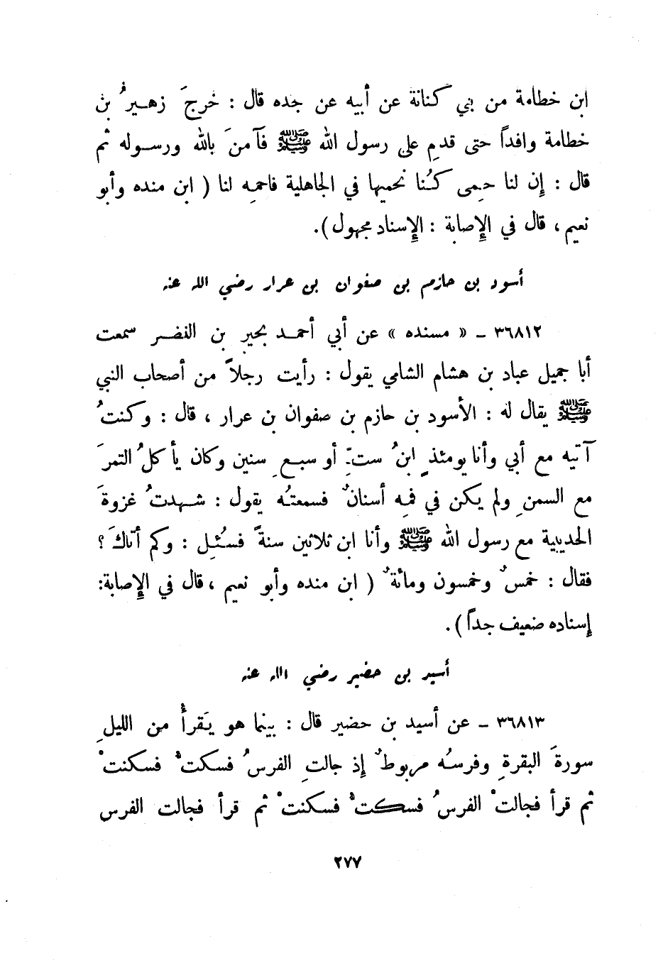 36813- عن أسيد بن حضير قال: بينما هو يقرأ من الليل سورة البقرة وفرسه مربوط إذ جالت الفرس فسكت فسكنت ثم قرأ فجالت الفرس فسكت فسكنت ثم قرأ فجالت الفرس