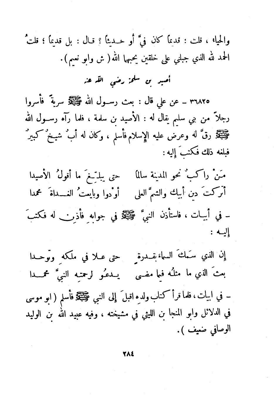 36825- عن علي قال: بعث رسول الله صلى الله عليه وسلم سرية فأسروا رجلا من بني سليم يقال له: الأصيد بن سلمة، فلما رآه رسول الله صلى الله عليه وسلم رق له وعرض عليه الإسلام فأسلم، وكان له أب شيخ كبير فبلغه ذلك فكتب إليه:
