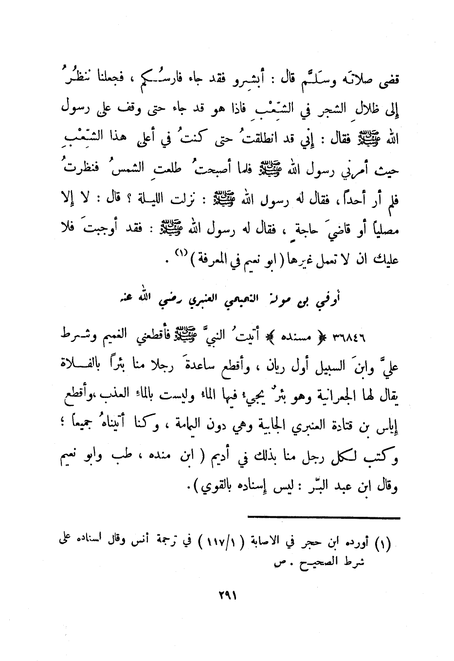 قضى صلاته وسلم قال: أبشروا فقد جاء فارسكم، فجعلنا ننظر إلى ظلال الشجر في الشعب فإذا هو قد جاء حتى وقف على رسول الله صلى الله عليه وسلم فقال: إني قد انطلقت حتى كنت في أعلى هذا الشعب حيث أمرني رسول الله صلى الله عليه وسلم فلما أصبحت طلعت الشمس فنظرت فلم أر أحدا، فقال له رسول الله صلى الله عليه وسلم: نزلت الليلة؟ قال: لا إلا مصليا أو قاضي حاجة، فقال له رسول الله صلى الله عليه وسلم: فقد أوجبت فلا عليك أن لا تعمل غيرها.