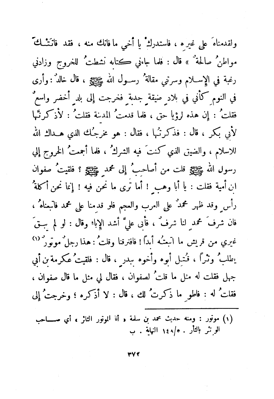 قال: فلما جاءني كتابه نشطت للخروج وزادني رغبة في الإسلام وسرتني مقالة رسول الله صلى الله عليه وسلم، قال خالد: وأرى في النوم كأني في بلاد ضيقة جدبة فخرجت إلى بلد أخضر واسع فقلت: إن هذه لرؤيا حق، فلما قدمت المدينة فقلت: لأذكرنها لأبي بكر، قال: فذكرتها، فقال: هو مخرجك الذي هداك الله للإسلام، والضيق الذي كنت فيه الشرك، فلما أجمعت الخروج إلى رسول الله صلى الله عليه وسلم قلت من أصاحب إلى محمد صلى الله عليه وسلم؟ فلقيت صفوان بن أمية فقلت: يا أبا وهب! أما ترى ما نحن فيه! إنما نحن أكلة رأس وقد ظهر محمد على العرب والعجم فلو قدمنا على محمد فاتبعناه، فإن شرف محمد لنا شرف، فأبى علي أشد الإباء وقال: لو لم يبق غيري من قريش ما اتبعته أبدا! فافترقنا وقلت: هذا رجل موتور1 يطلب وترا، قتل أبوه وأخوه ببدر، قال: فلقيت عكرمة ابن أبي جهل فقلت له مثل ما قلت لصفوان، فقال لي مثل ما قال صفوان، فقلت له: فاطو ما ذكرت لك، قال: لا أذكره؛ وخرجت إلى