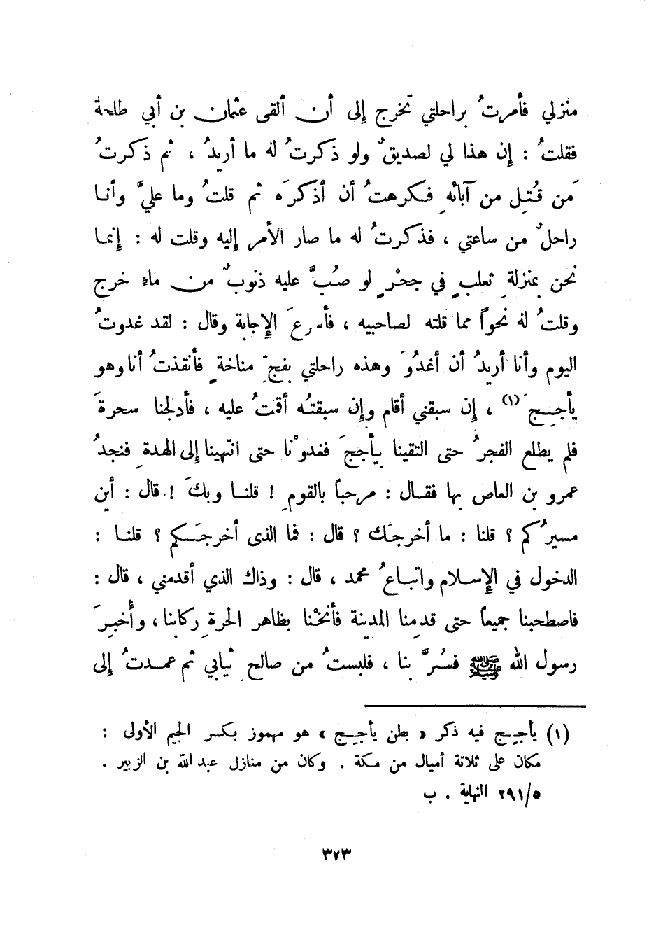 منزلي فأمرت براحلتي تخرج إلى أن ألقى عثمان بن أبي طلحة فقلت: إن هذا لي لصديق ولو ذكرت له ما أريد، ثم ذكرت من قتل من آبائه فكرهت أن أذكره ثم قلت وما علي وأنا راحل من ساعتي، فذكرت له ما صار الأمر إليه وقلت له: إنما نحن بمنزلة ثعلب في جحر لو صب عليه ذنوب من ماء خرج وقلت له نحوا مما قلته لصاحبيه. فأسرع الإجابة وقال: لقد غدوت اليوم وأنا أريد أن أغدو وهذه راحلتي بفج مناخة فأنقذت أنا وهو يأجج1، إن سبقني أقام وإن سبقته أقمت عليه، فأدلجنا سحرة فلم يطلع الفجر حتى التقينا بيأجج فغدونا حتى انتهينا إلى الهدة فنجد عمرو بن العاص بها فقال: مرحبا بالقوم! قلنا وبك! قال: أين مسيركم؟ قلنا: ما أخرجك؟ قال: فما الذي أخرجكم؟ قلنا: الدخول في الإسلام واتباع محمد، قال: وذاك الذي أقدمني، قال: فاصطحبنا جميعا حتى قدمنا المدينة فأنخنا بظاهرة الحرة ركابنا، وأخبر رسول الله صلى الله عليه وسلم فسر بنا، فلبست من صالح ثيابي ثم عمدت إلى